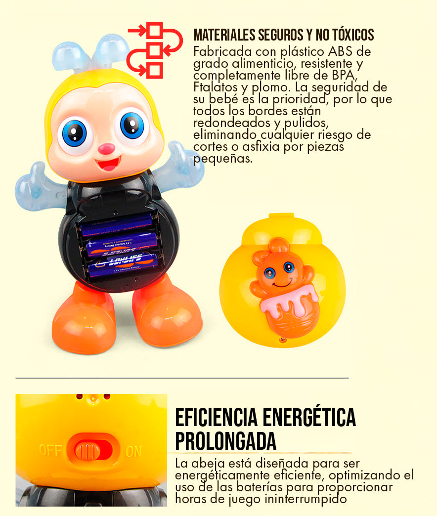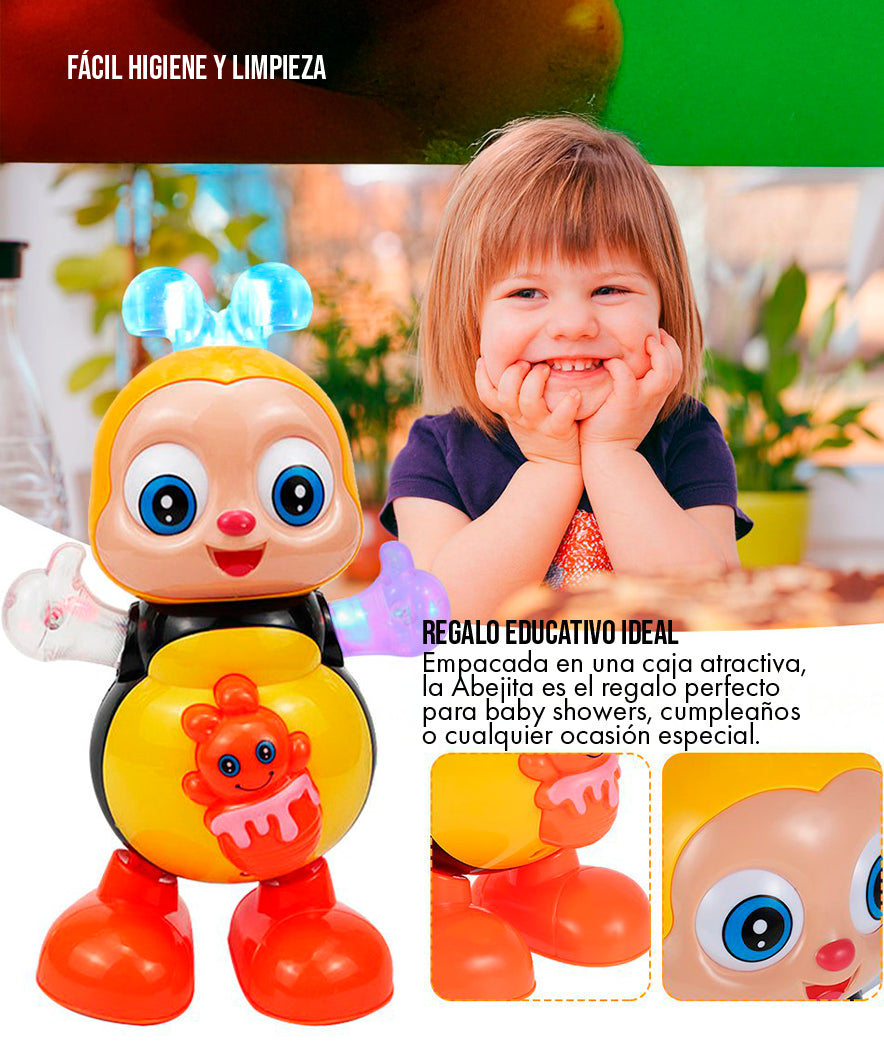 La música tiene el poder de estimular la mente y el alma. Las melodías dinámicas y el ritmo alegre de la Abejita inician una respuesta natural en los bebés: el baile. Incluso antes de caminar, su pequeño comenzará a balancearse, a reír y a experimentar la alegría de la música, sentando las bases para una vida llena de ritmo y expresión creativa.