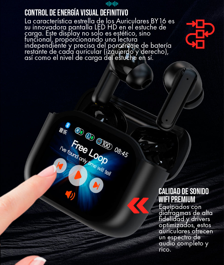 Absolutamente. La pantalla LED es una de las características más innovadoras de los BY16. Muestra tres lecturas digitales independientes y altamente precisas. Podrá ver el porcentaje exacto de batería para el auricular izquierdo, el auricular derecho y, en el centro, el porcentaje restante del estuche de carga. Esto elimina la especulación y le permite planificar sus recargas con total certeza, un avance significativo sobre los modelos que solo usan luces indicadoras.