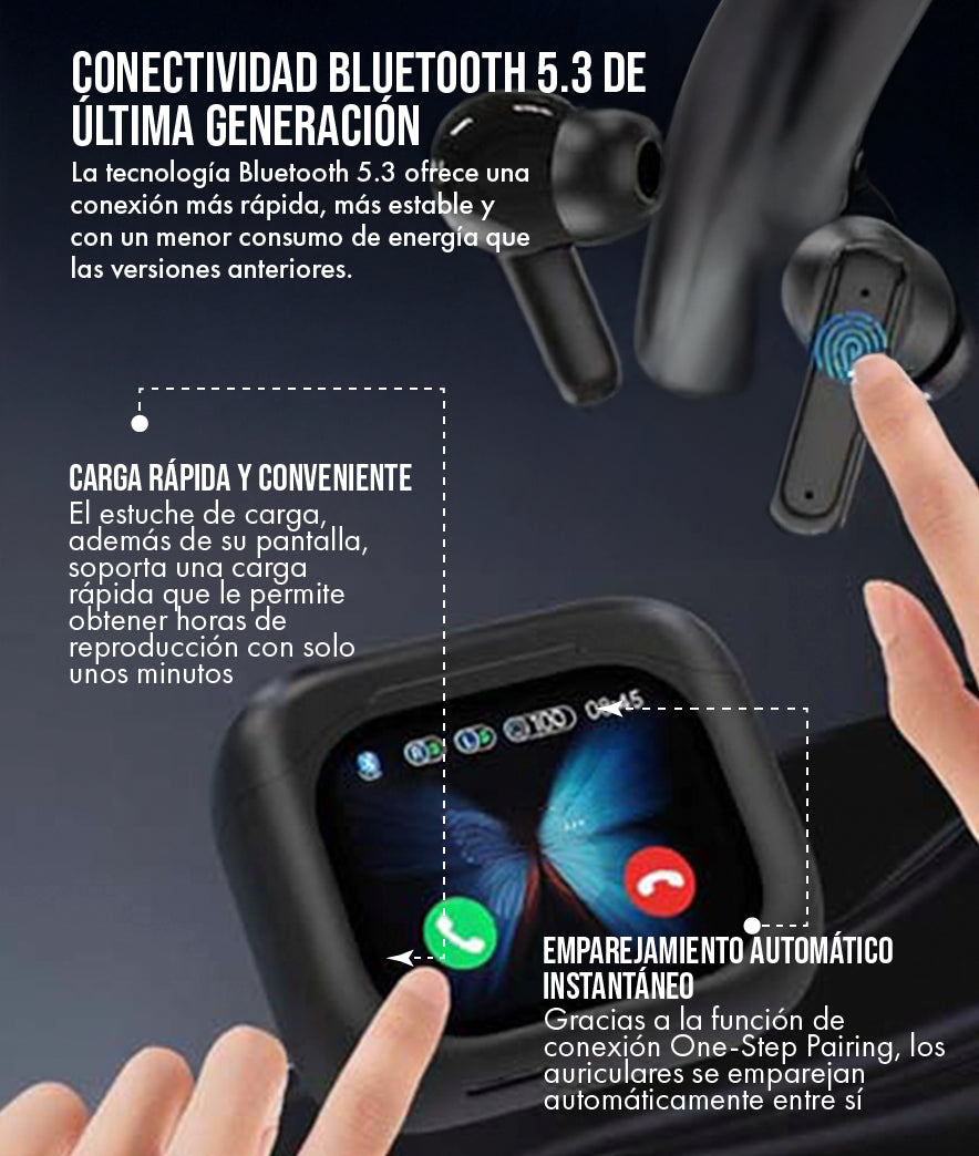 La frustración de la batería muerta es cosa del pasado. Con la pantalla inteligente del BY16, tienes el poder de saber exactamente cuánta energía te queda en cada auricular y en el estuche. Nunca más te quedarás sin tu playlist favorita a mitad de tu rutina o perderás una llamada crucial. ¡VIVE LA LIBERTAD DE LA INFORMACIÓN INSTANTÁNEA!
