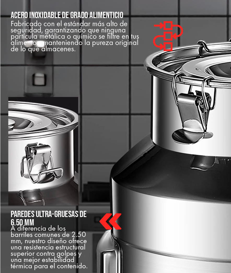 Es frustrante invertir en ingredientes de calidad para que se arruinen por un mal recipiente. Con el Barril Pro-Steel, redescubrirás el sabor real de tus productos, protegidos por una barrera impenetrable de acero puro.