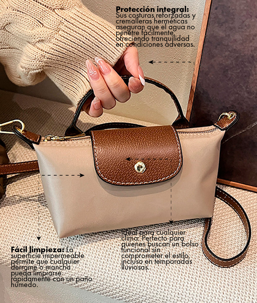 El material del bolso es resistente a salpicaduras ligeras y a la lluvia, pero no es completamente impermeable. Se recomienda secarlo inmediatamente si se moja para mantener su calidad y evitar daños.