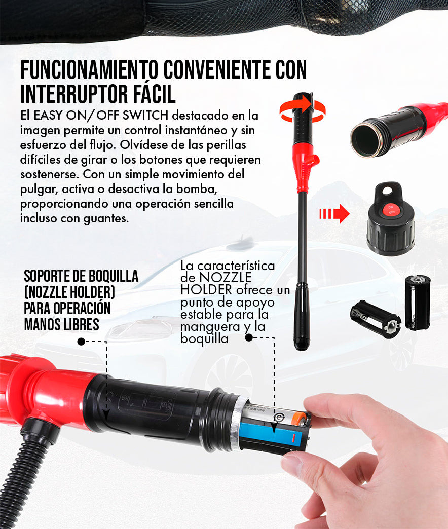 Nuestra bomba está diseñada para la máxima portabilidad y seguridad en entornos sin acceso a energía eléctrica. Funciona con baterías (generalmente pilas tipo D o AA, dependiendo del modelo específico) que proporcionan la energía necesaria para el motor de alta potencia. Esto la hace ideal para uso en el campo, en vehículos, en el mar o en situaciones de emergencia. La autonomía es excelente, permitiendo la transferencia de cientos de galones con un solo juego de baterías de calidad.