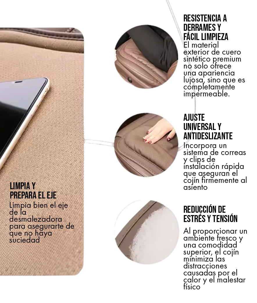 La instalación es extraordinariamente sencilla y no requiere herramientas. El cojín viene equipado con un sistema de anclaje universal que incluye correas ajustables que se deslizan alrededor del asiento y clips de seguridad que se insertan en el pliegue del asiento. El proceso completo no toma más de dos minutos. El objetivo es asegurar un ajuste firme y antideslizante, para que el cojín se sienta como una parte integral de su asiento.