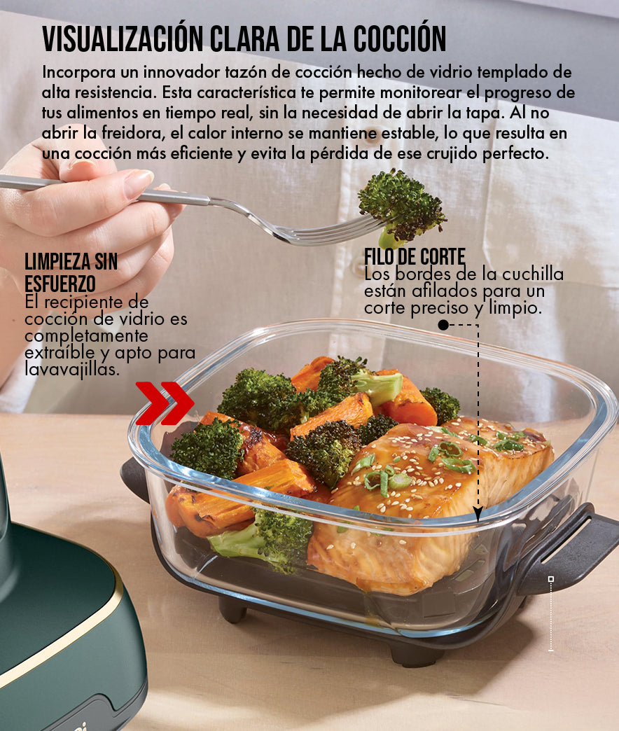 Imagina el aroma de unas alitas de pollo perfectamente sazonadas, con la piel crujiente y la carne jugosa, listas en minutos. Esta freidora no solo cocina, sino que intensifica el sabor de los alimentos, sellando sus jugos naturales con el poder de sus 1500W.