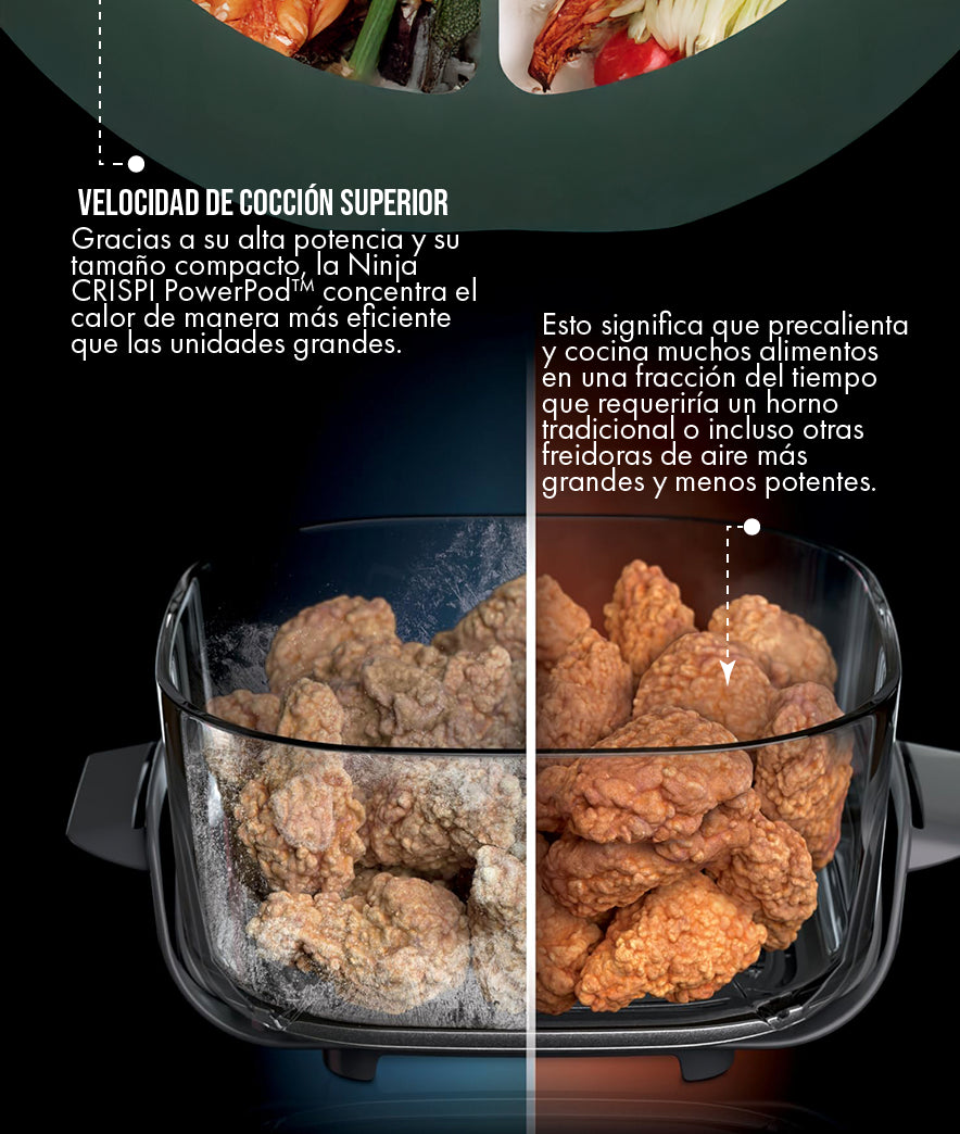 Sí, la PowerPod está equipada con un elemento calefactor de 1500 vatios, que es la potencia estándar en modelos mucho más grandes. Logra esta eficiencia concentrando la tecnología de flujo de aire en un espacio más pequeño. Esto permite que la PowerPod alcance y mantenga altas temperaturas más rápidamente, cocinando los alimentos de forma más veloz y logrando un crujido superior, ya que el aire caliente impacta con mayor fuerza y constancia en la superficie de los alimentos.
