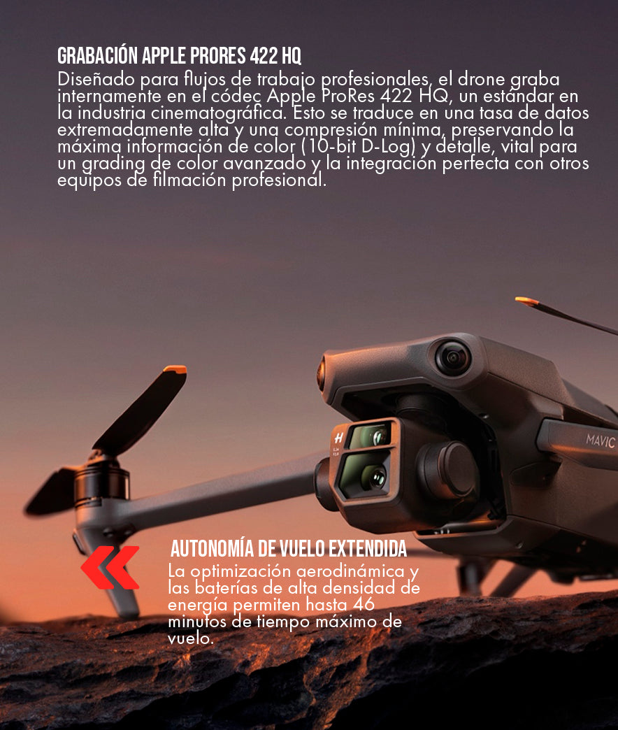 La principal diferencia radica en el sensor de imagen y el códec de grabación. Nuestro drone utiliza un gran sensor CMOS 4/3, desarrollado por Hasselblad, que captura 6K, lo que permite un rango dinámico muy superior y un rendimiento en baja luz excepcional en comparación con los sensores de 1/2 pulgada de la competencia. Además, la capacidad de grabar en Apple ProRes 422 HQ internamente es un estándar de la industria cinematográfica que asegura la máxima calidad y flexibilidad para la postproducción, algo que los modelos estándar 4K no ofrecen, ya que solo graban en códecs de consumo como H.265.