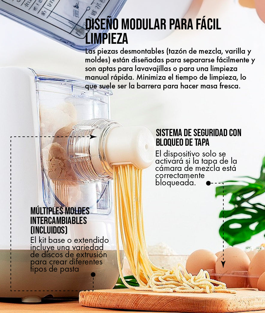 ¡EL SECRETO DE LOS CHEFS AHORA EN SU HOGAR! La textura elástica y la extrusión uniforme de la MASSA MAGICA EXPRESS garantizan una pasta de aspecto profesional. Conviértase en el anfitrión estrella sin esfuerzo.