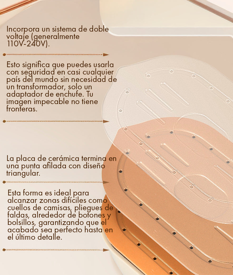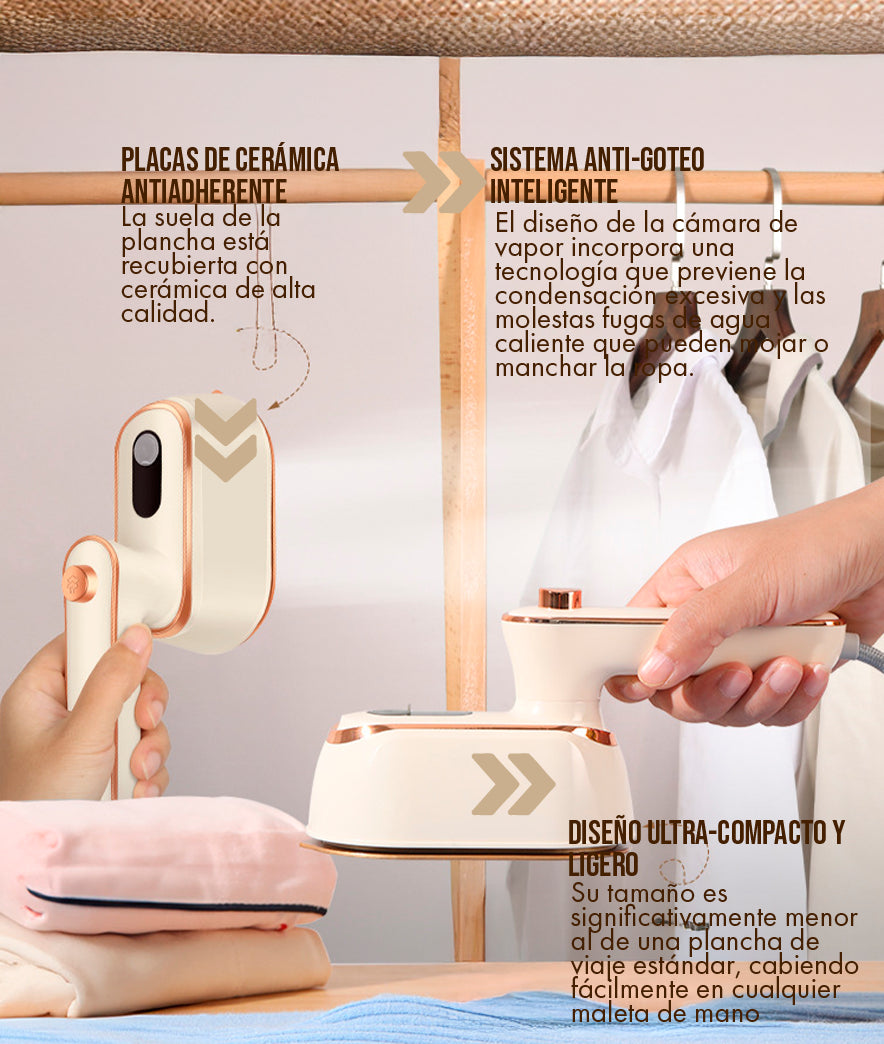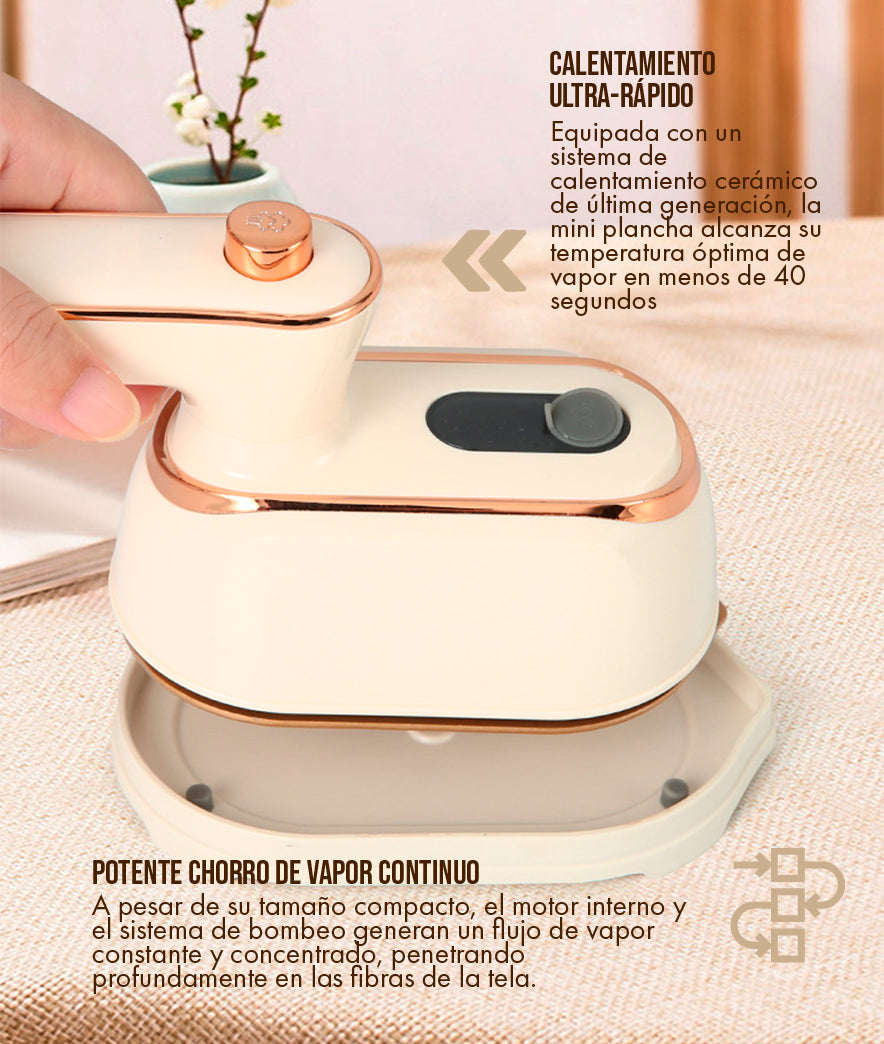 Es extremadamente portátil. Su diseño ha sido optimizado para la eficiencia del espacio. La Mini Plancha de Vapor tiene aproximadamente el tamaño de un smartphone grande y un peso mínimo, lo que la hace ideal para caber en cualquier maleta de mano, mochila o incluso en un bolso grande. Además, su mango es plegable o se puede almacenar de forma que ocupe el mínimo espacio, resolviendo el problema de las planchas de viaje voluminosas.
