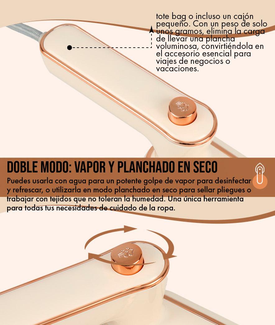 Olvida las arrugas que gritan "viaje largo". Nuestra Mini Plancha de Vapor te ofrece un acabado de calidad de tintorería en minutos y en la comodidad de tu habitación. Su potente vapor no solo alisa, sino que le devuelve la caída y la frescura a tus tejidos. Proyecta profesionalismo y atención al detalle sin gastar una fortuna en servicios externos.