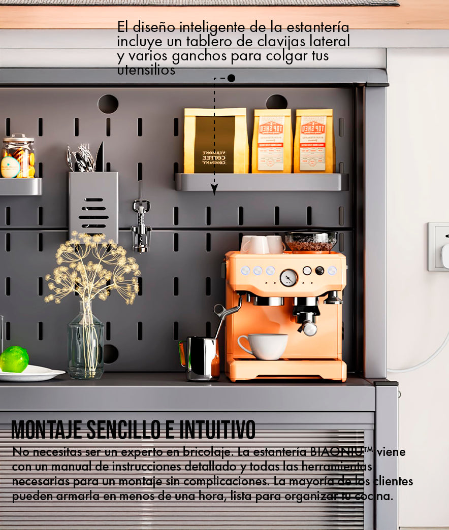 ¡RECUPERA EL CONTROL Y LA TRANQUILIDAD EN TU COCINA! La estantería BIAONIU™ te da el espacio que necesitas para que cada cosa tenga su lugar. Siente la paz de un mesón despejado, y la satisfacción de saber exactamente dónde está todo. El orden te da claridad mental y te hace amar tu hogar.