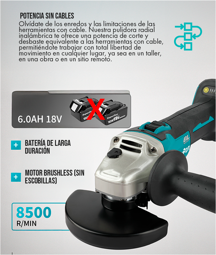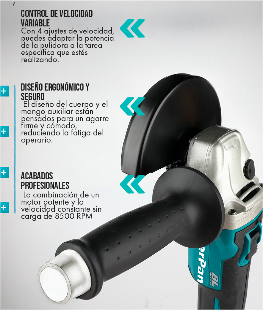 ¡No más interrupciones! Con el poder de nuestro motor Brushless y la batería de larga duración, la pulidora SuperPan te brinda una potencia constante y confiable. Experimenta la tranquilidad de saber que tu herramienta rendirá al máximo, de principio a fin.