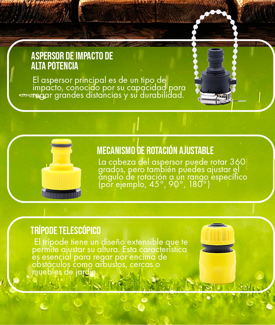 El Aspersor "Aqua-Smart" es un sistema de riego automático que consta de un aspersor de alta potencia montado sobre un trípode metálico y ajustable. Simplemente lo conectas a tu manguera de jardín, lo colocas en el lugar deseado y abres el grifo. El aspersor girará automáticamente para distribuir el agua de manera uniforme sobre un área amplia, permitiéndote regar tu jardín sin tener que sostener una manguera.