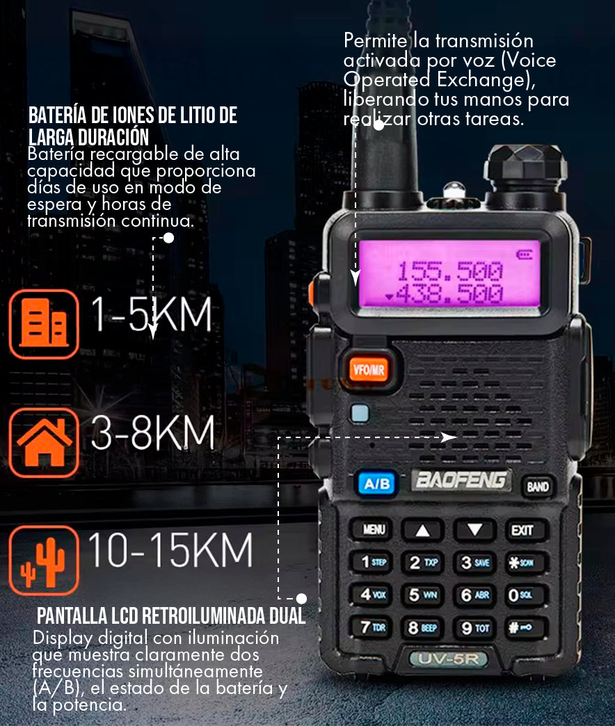 Con 5W de potencia, puede alcanzar fácilmente 5-10 km en áreas abiertas (mar o campo), y hasta 1-3 km en áreas urbanas o boscosas.