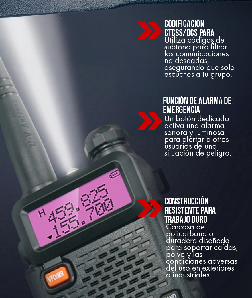 5 Veces Más Potente que Walkie-Talkies FRS: Con 5W de potencia, es cinco veces más potente que los walkie-talkies FRS estándar de 1W (máx).